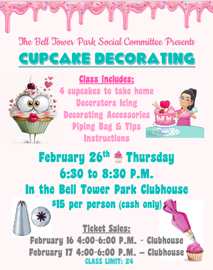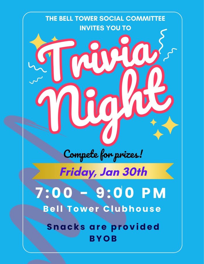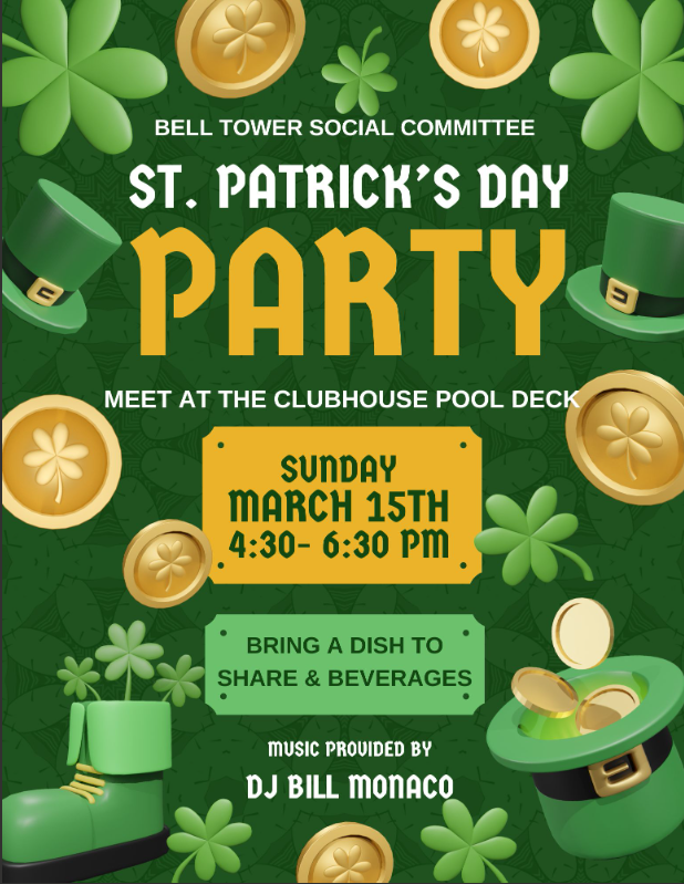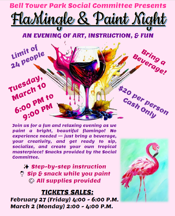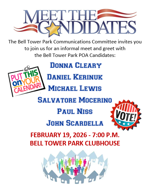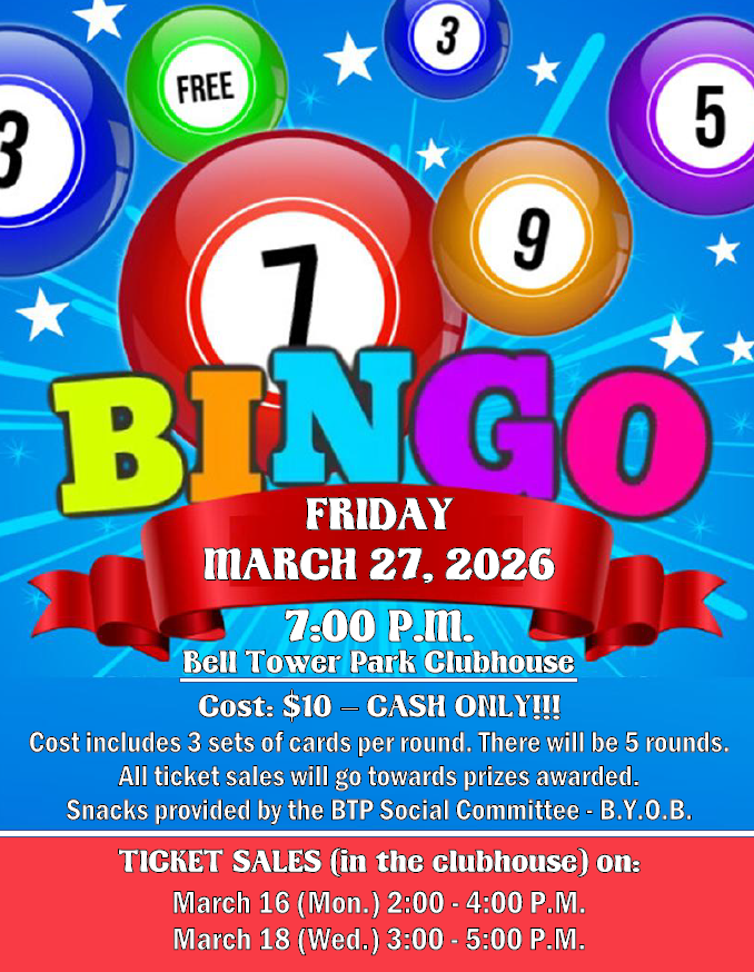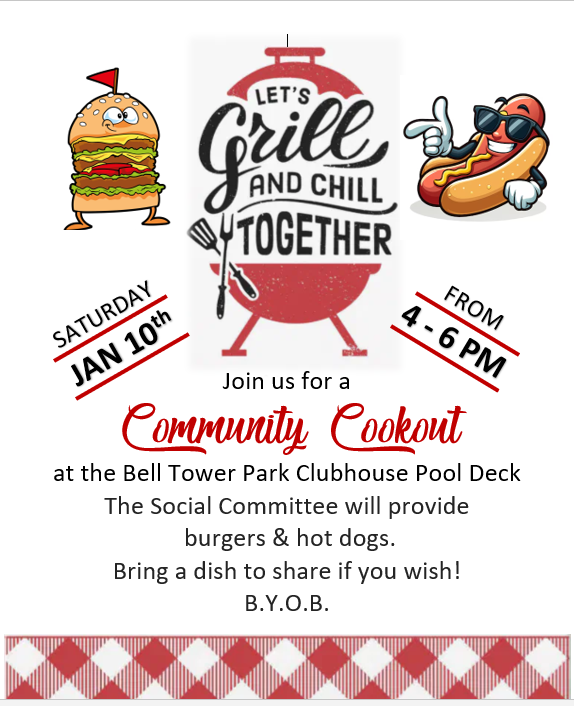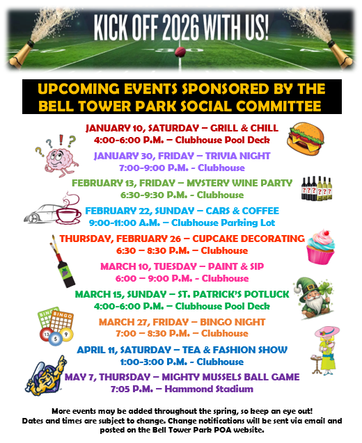 If you are viewing this page during the summer/off season, some flyers below will appear to be PAST events. They remain in view to give residents a taste of the types of activities we enjoy here in Bell Tower Park. As the Social Committee completes plans for the upcoming season, new flyers will be posted here as well as on the ``Announcements`` section of the ``Resident Dashboard``.